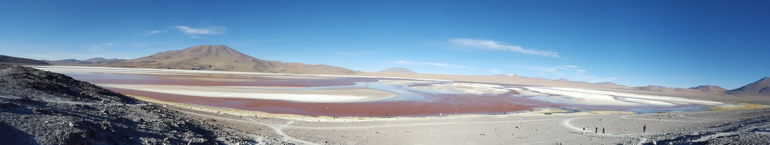 Als das Gepäck verstaut war und die Plätze bezogen waren, ging die Reise durch die karge Landschaft Boliviens los. Unsere Route führte uns an verschiedene Lagunen sowie zu einer Geysirlandschaft auf rund 5’000 Meter über Meer. Um gegen die viel beschriebene Höhenkrankheit gewappnet zu sein, deckten wir uns vorgängig mit Koka-Bonbons und Kokablättern ein. Zu unserer Überraschung überstanden wir den Aufstieg jedoch ohne Beschwerden, was uns jedoch nicht daran hindern sollte, trotzdem auf den Kokablättern rumzukauen. Diese Beschäftigung stellte sich als weniger appetitlich heraus als erhofft, fühlte es sich doch etwa so an, als wenn man den Inhalt eines Teebäutels als Kaugummi benutzen würde. Weit angenehmer war das Benutzen des menschlichen Kauwerks, als uns bei der Unterkunft für die erste Nacht das Mittagessen serviert wurde. Wie für die Schweizer Reisegruppe geplant, gab es eine Art Mini-Cervelats mit Kartoffelstock, was uns ein erstes Mal die schlechten Touren-Bewertungen hinterfragen liess. Nach dem Mittagessen ging es weiter zur Laguna Colorada, welche das Highlight des ersten Tages darstellen sollte. Bereits die ersten Lagunen auf der Tour waren wunderschön, durch unsere Camper-Rundreise in San Pedro waren wir uns jedoch schon ein wenig an solche Anblicke gewohnt. Die Laguna Colorada machte ihrem Namen alle Ehre und präsentierte sich in verschiedensten Farben und beheimatete hunderte Flamingos und Lamas.